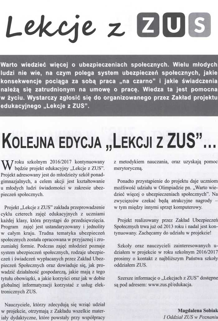 - Rośnie zainteresowanie projektem "Lekcje z ZUS". Zajęcia przygotowują uczniów do wejścia na rynek pracy - www.biznes.newseria.pl 20.09.2016 r. (link do strony zewnętrznej)