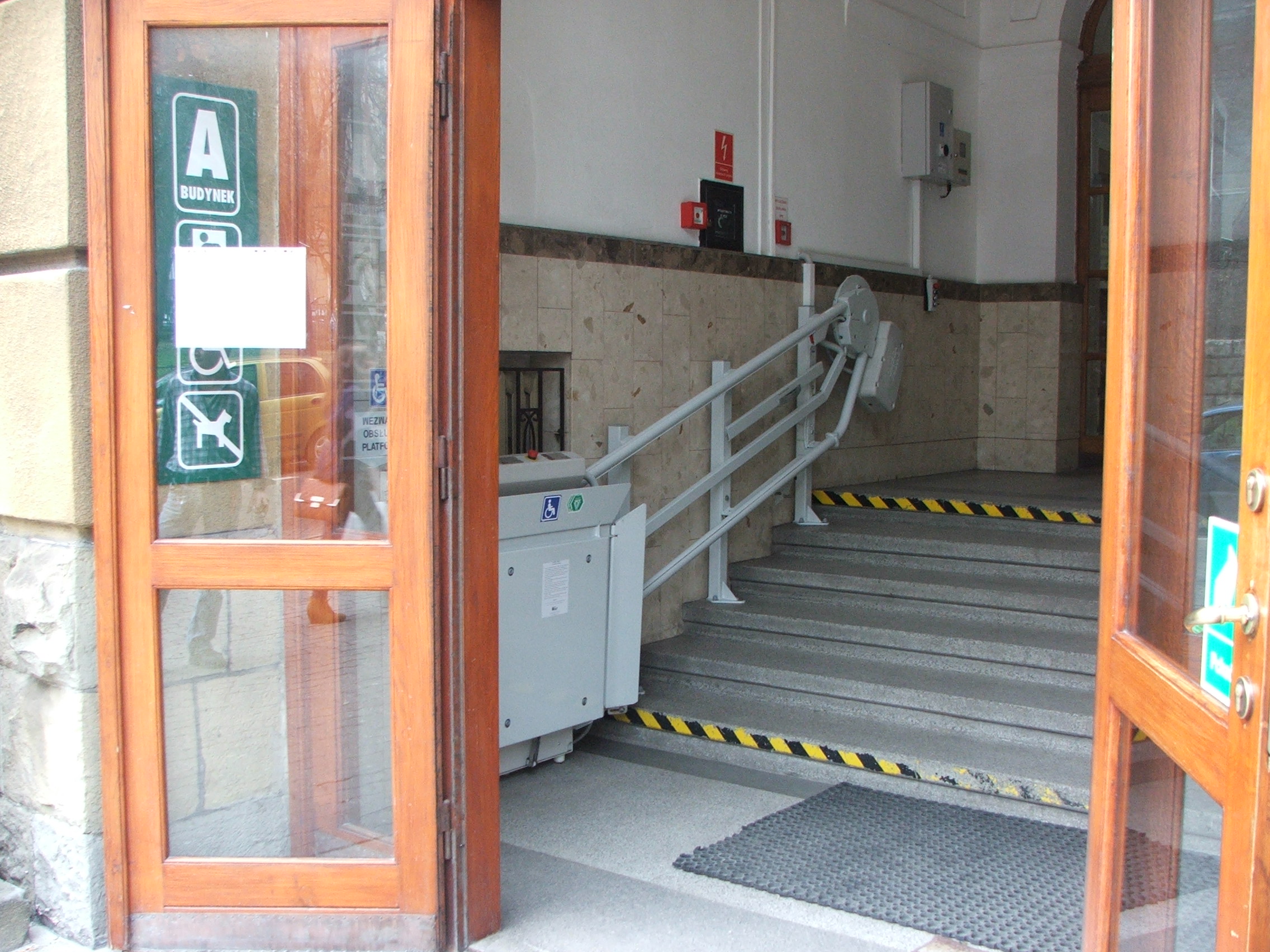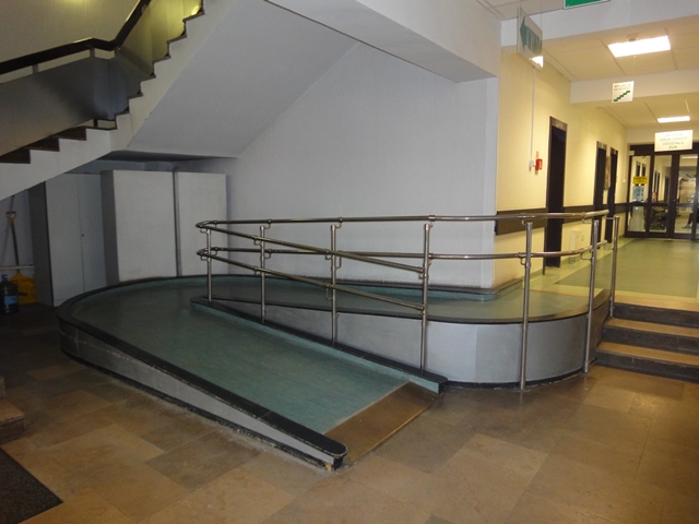 - czy przy wejściu do budynku są schody, a jeśli tak, to jakie udogodnienia są zamontowane: pochylnia, winda zewnętrzna, platforma schodowa, transporter schodowy itp.,
