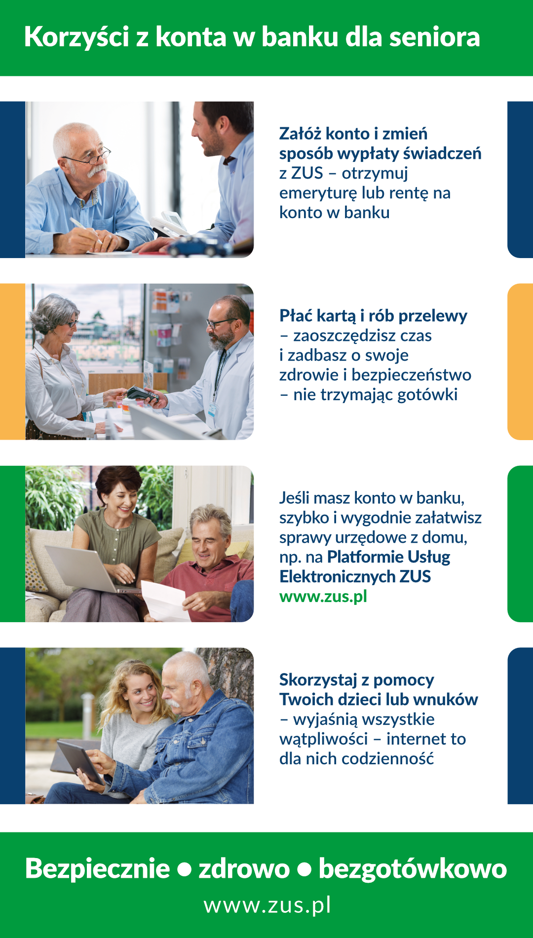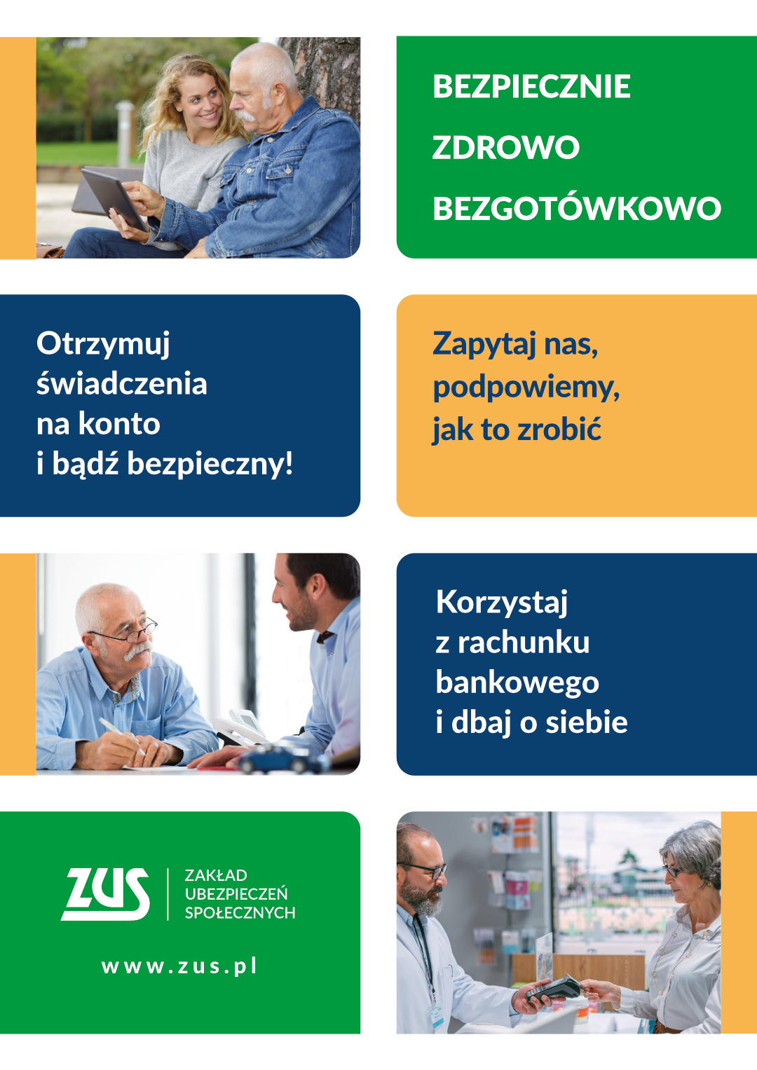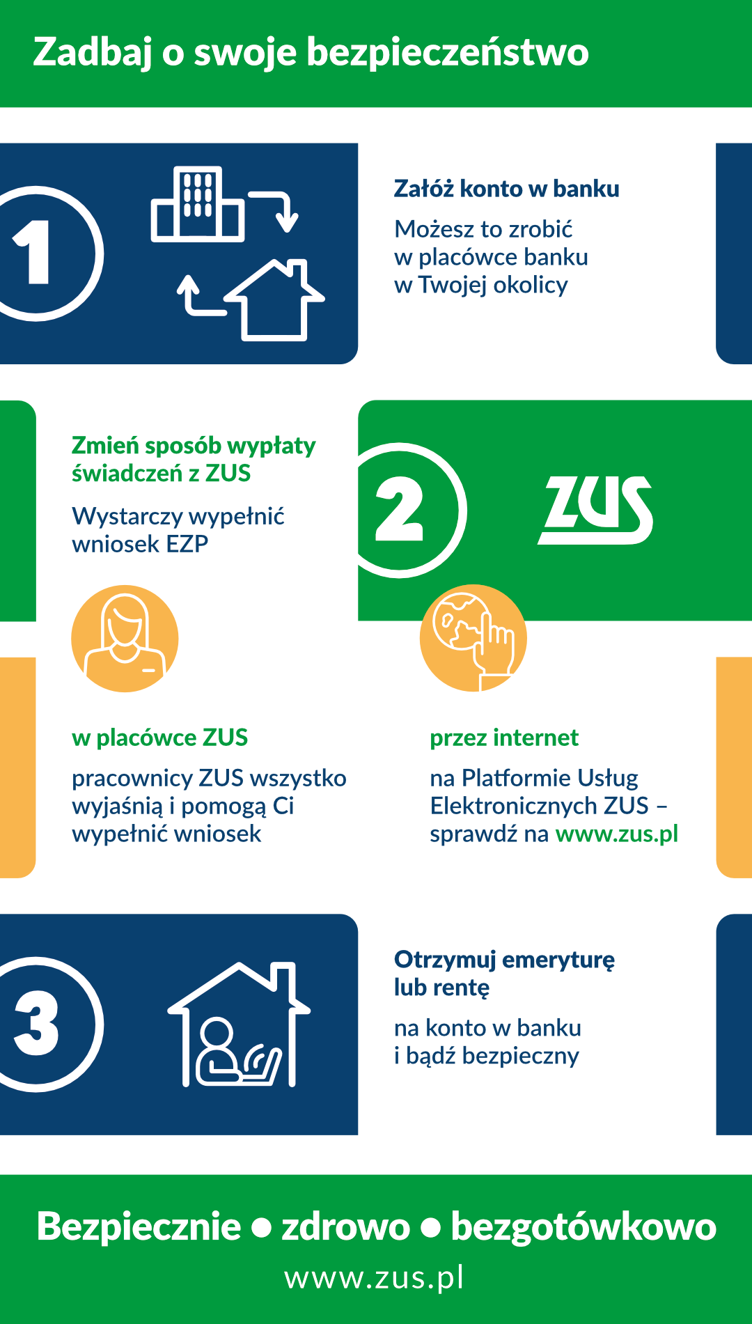 - Ulotka „Bezpiecznie, zdrowo, bezgotówkowo – otrzymuj świadczenia na konto i bądź bezpieczny” (plik pdf, 234 kb)