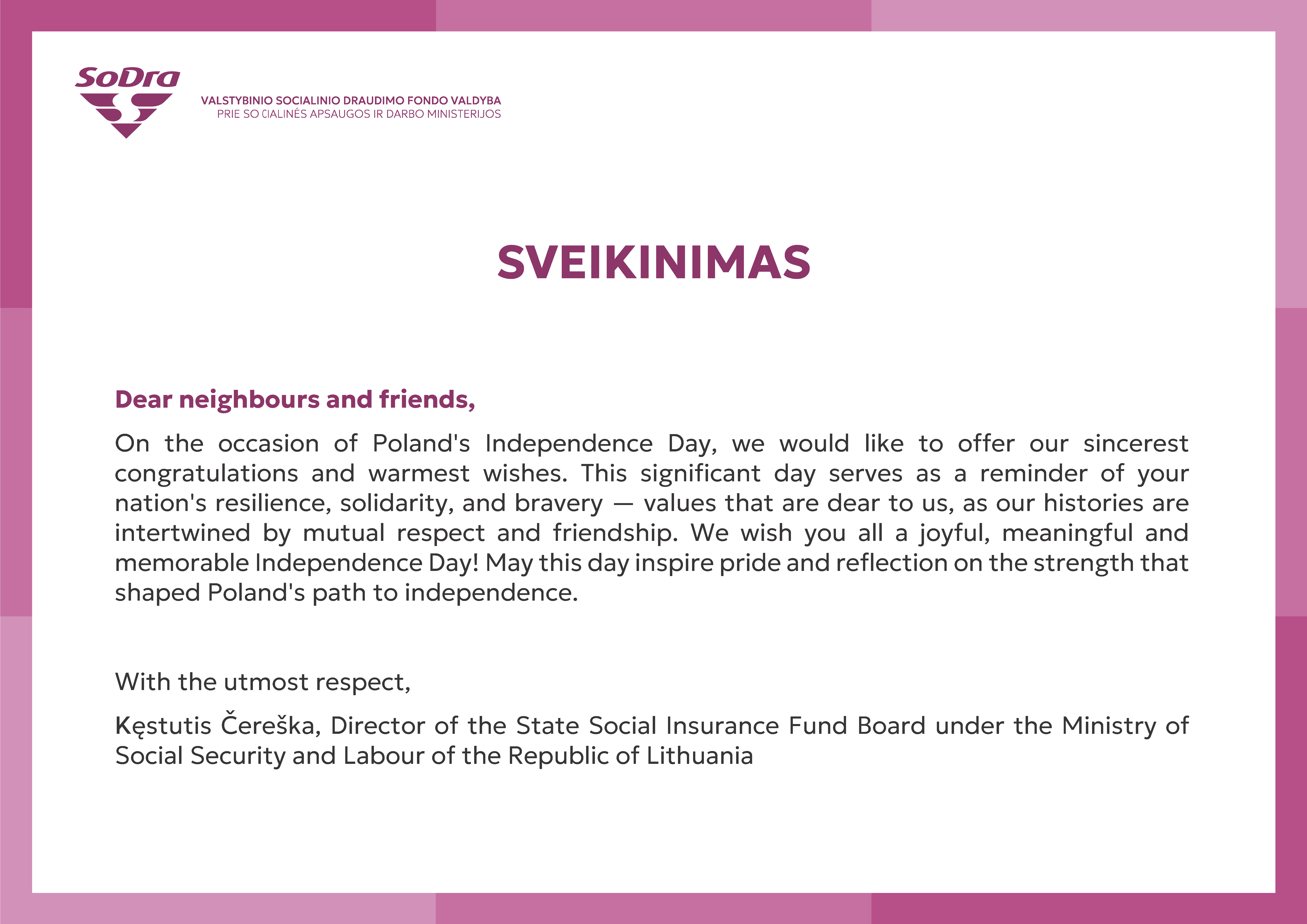 Z okazji tak ważnego dla Polaków dnia, dyrektor Zarządu Państwowego Funduszu Ubezpieczeń Społecznych Republiki Litewskiej (Sodra), pan Kęstutis Čereška przekazał pełne serdeczności i szacunku życzenia. Poniżej prezentujemy ich tłumaczenie na język polski.